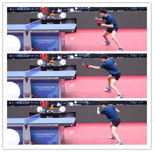 如上圖,林昀儒接發(fā)球的進攻意識很強,他側(cè)身到正手位準備使用反手擰拉處理接發(fā)球。移動中,他隨著來球節(jié)奏逐漸引開手腕,但當他準確判斷到來球的落點、旋轉(zhuǎn)及弧線后,發(fā)現(xiàn)并不適合使用反手擰拉,于是他及時調(diào)整還沒有完全展開的手腕,選擇了更為合理的擊球方式,這一點應變的速度非常快。在完成精準找位的同時,林昀儒調(diào)整板形改擰為劈。 雖然劈長的威脅小于反手擰拉,但林昀儒通過瞬間發(fā)力化解了對方發(fā)球的旋轉(zhuǎn),并利用劈長落點向?qū)κ质海诓皇俣鹊那闆r下盡量給對方增加銜接的難度。