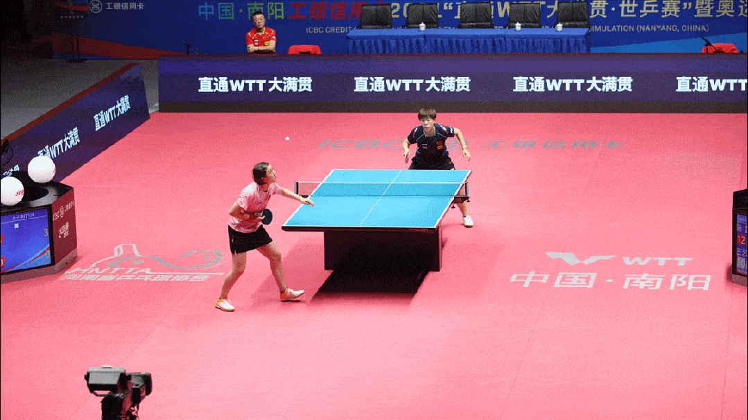 陳夢(mèng)隨著來球完成調(diào)整,在讓位的同時(shí)打開了拉直線的角度。她快速向上揮臂,吃住來球,拉出充足弧線,在動(dòng)作的后半段適當(dāng)外翻前臂和手腕前頂出球,增加回球質(zhì)量和弧線長(zhǎng)度。這個(gè)過程中有個(gè)細(xì)節(jié)大家可以注意一下,即陳夢(mèng)用反手拉出的球已經(jīng)脫離球板,但球的位置幾乎沒太大變化,這說明她這板吃球非常深。