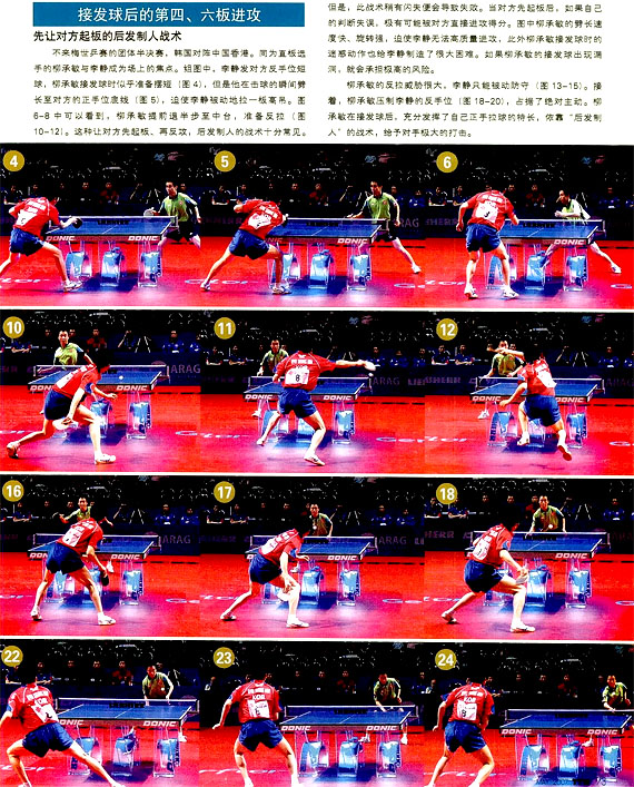 不來梅世乒賽的團(tuán)體半決賽,韓國(guó)對(duì)陣中國(guó)香港。同為直板選手的柳承敏與李靜成為場(chǎng)上的焦點(diǎn)。組圖中,李靜發(fā)對(duì)方反手位短球,柳承敏接發(fā)球時(shí)似乎準(zhǔn)備擺短(圖4),但是他在擊球的瞬間劈長(zhǎng)至對(duì)方的正手位底線(圖5),迫使李靜被動(dòng)地拉一板高吊。圖6—8中可以看到,柳承敏提前退半步至中臺(tái),準(zhǔn)備反拉(圖10—12)。這種讓對(duì)方先起板、再反攻,后發(fā)制人的戰(zhàn)術(shù)十分常見。但是,此戰(zhàn)術(shù)稍有閃失便會(huì)導(dǎo)致失敗。當(dāng)對(duì)方先起板后,如果自己的判斷失誤,極有可能被對(duì)方直接進(jìn)攻得分。圖中柳承敏的劈長(zhǎng)速度快、旋轉(zhuǎn)強(qiáng),迫使李靜無法高質(zhì)量進(jìn)攻,此外柳承敏接發(fā)球時(shí)的迷惑動(dòng)作也給李靜制造了很大困難。如果柳承敏的接發(fā)球出現(xiàn)漏洞,就會(huì)承擔(dān)極高的風(fēng)險(xiǎn)。www.qikan.com.cnBTakMEgUK4Ig1Tua