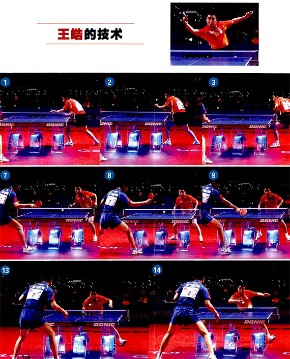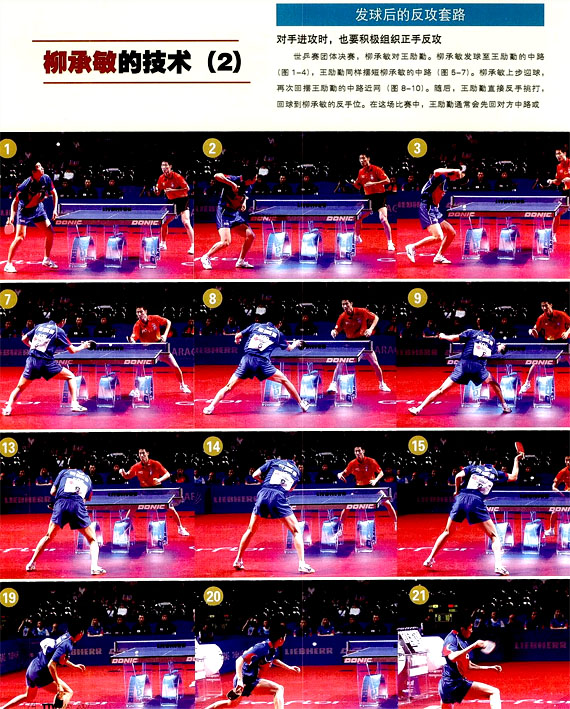 在此我們介紹世界名將柳承敏和王皓的實(shí)戰(zhàn)戰(zhàn)例。通過組圖,我們來分析韓國(guó)選手與中國(guó)選手直板進(jìn)攻技術(shù)的不同風(fēng)格。