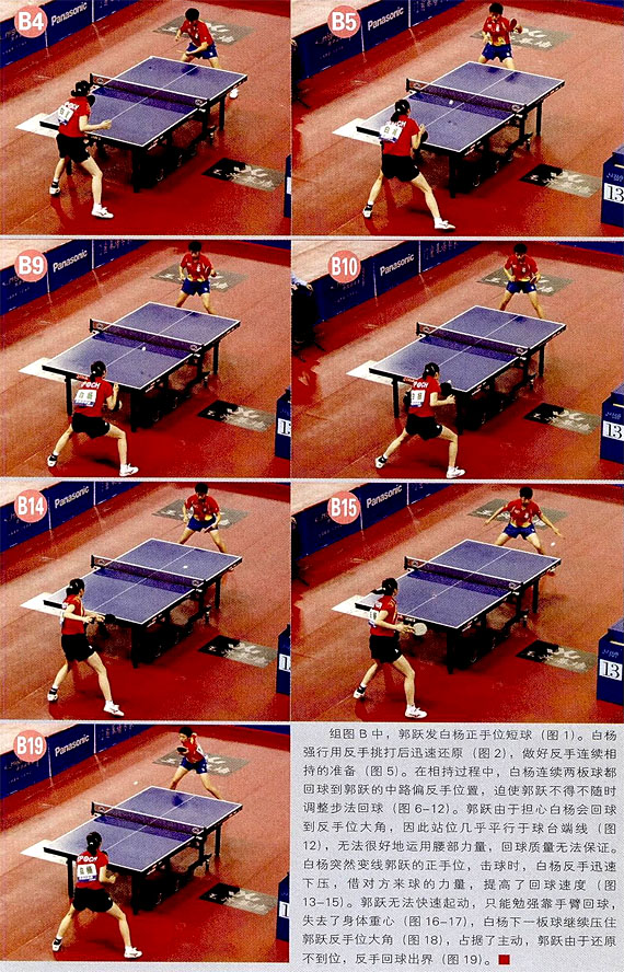 組圖A中,白楊發(fā)側(cè)下旋半出臺球到郭躍的中路偏反手位置(圖2),郭躍跨一步到中路,在臺內(nèi)用反手快拉斜線(圖3)。白楊突然發(fā)力彈擊到郭躍的反手位大角,此時(shí)我們可以看到擅長正手技術(shù)的郭躍準(zhǔn)備側(cè)身還擊(圖4)。由于白楊回球的線路刁鉆,郭躍只能繼續(xù)用反手回球 (圖5—6)。郭躍回球后迅速后撤,這樣可以增大擊球空間,有利于發(fā)力回球,而白楊繼續(xù)壓住郭躍的反手位;遏制對方側(cè)身進(jìn)攻(圖8)。此時(shí)郭躍增大轉(zhuǎn)腰的幅度,加力回球到白楊反手位 (圖9—10),白楊穩(wěn)健地用反手飄一板斜線(圖11一13)。“飄’這項(xiàng)技術(shù)通常是顆粒膠皮打法的特長,一般在來球的最高點(diǎn)擊球,擊球瞬間帶有摩擦,借來球的力量回球。飄過去的球速度較慢,飄忽不定,當(dāng)球落臺時(shí)沒有強(qiáng)烈地向前沖擊的力量,這種回球可以很好地改變擊球的節(jié)奏。www.qikan.com.cnGQ8yD6jSAEgoccb7 郭躍盯住來球,準(zhǔn)備連續(xù)發(fā)力,但是來球速度突然減慢,而且不向前走,郭躍只能將手臂盡量伸直,靠手臂和手腕來調(diào)節(jié)回球的弧線(圖14)。郭躍這板回球直逼白楊反手位太角,隨后郭躍果斷側(cè)身,準(zhǔn)備側(cè)身用正手給于致命一擊(圖15)。白楊面對頗具威脅的來球十分冷靜,她迅速跨右腿,調(diào)整好站位,借來球的力量突然回直線到郭躍的正手位空檔。白楊的回球速度快,落點(diǎn)刁鉆,贏得了漂亮的一分(圖15—18)。www.qikan.com.cnGQ8yD6jSAEgoccb7