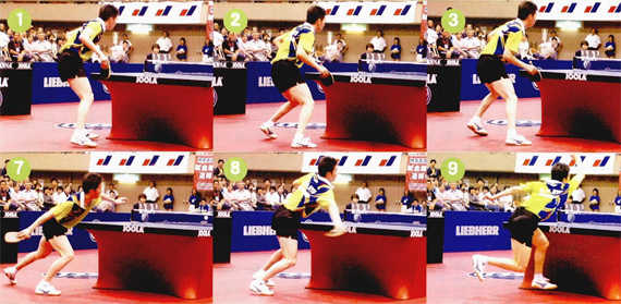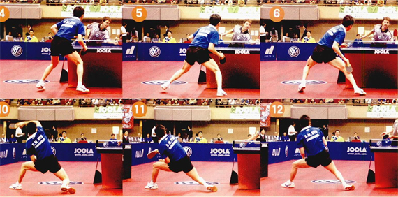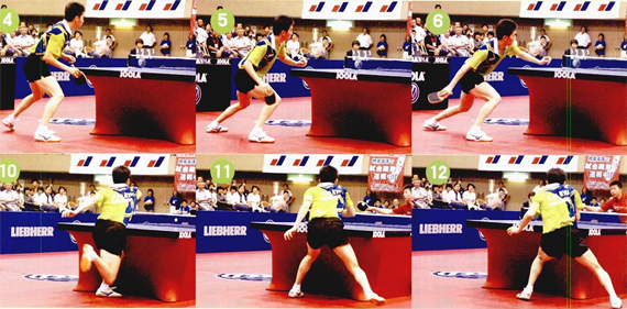 正手連續(xù)進(jìn)攻時(shí),腳下的移動(dòng)范圍比較小,此時(shí)可以不用交叉步,而是用跨步。下列組圖中,柳承敏轉(zhuǎn)腰引拍后,身體重心從右腳移動(dòng)到左腳,并沒有使用交叉步,這樣可以避免身體向右側(cè)傾斜,而且可以快速還原,有利于快速連續(xù)進(jìn)攻。