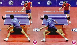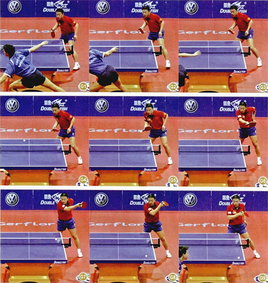 組圖G為馬林側(cè)擠弧圈球的實例,直板反手側(cè)擠是一項技巧性很強(qiáng)的防守技術(shù),尤其在防守弧圈球的時候可以改變回球的節(jié)奏和旋轉(zhuǎn),給對方造成不小的威脅。對業(yè)余選手來說,掌握反手側(cè)擠的技術(shù)至關(guān)重要。
