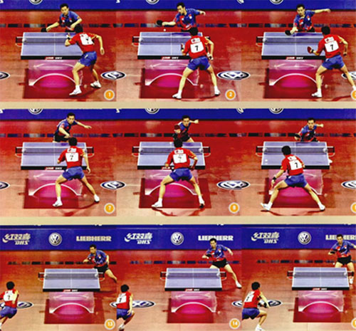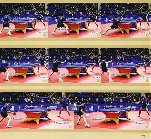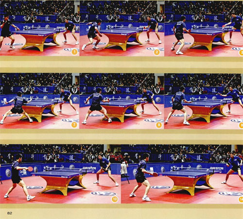 組圖A中,陳玘發(fā)短球到孔令輝正手,孔令輝擺短斜線(圖3),陳玘側(cè)身回?cái)[到孔令輝反手(圖5),孔令輝右腳上步,手腕最大幅度地內(nèi)收,側(cè)擰到陳圮的正手大角(圖6—9)。孔令輝的這板反手側(cè)擰速度快,旋轉(zhuǎn)十分強(qiáng)烈,落點(diǎn)刁鉆。陳玘的回?cái)[質(zhì)量并不差,而且在擺短后,陳玘做好了相持的準(zhǔn)備,但由于束球的速度太快,還帶有強(qiáng)烈的側(cè)拐,因此只能被動(dòng)地?fù)渚?圖10-11)。孔令輝反手上手之后不慌不忙,他已經(jīng)封死了陳玘的回球線路,用反手輕擋一板直線(圖13-15),再次以落點(diǎn)調(diào)動(dòng)陳玘,陳圮雖拼命跑動(dòng),但最終還是回球失誤。 這組套路中,孔令輝打得非常巧妙。孔令輝第一板接發(fā)球擺短遏制了陳玘的上手,陳玘回?cái)[后,站位離球臺(tái)很近,而且身體幾乎平行于球臺(tái),這樣的站位并不利于陳玘的進(jìn)攻。孔令輝抓住機(jī)會(huì),反手側(cè)擰一板強(qiáng)烈的側(cè)旋,回球到陳玘的正手位大角,靠速度和落點(diǎn)壓制住對(duì)方。陳玘的起動(dòng)速度較慢,在撲正手的過程中拼命勾住手腕拉一板側(cè)旋,陳玘的這板拉球十分勉強(qiáng),雖然撲教成功,但身體的重心完全喪失。孔令輝早已等在反手位輕擋一板直線。孔令輝的反手回球雖然速度不快,但他在擊球時(shí)將拍形外撇,借對(duì)方來球的旋轉(zhuǎn),使回球同樣帶有強(qiáng)烈的側(cè)旋,再次以旋轉(zhuǎn)和落點(diǎn)調(diào)動(dòng)對(duì)手。孔令輝先是依靠速度和落點(diǎn)壓制對(duì)方,再以旋轉(zhuǎn)和落點(diǎn)調(diào)動(dòng)對(duì)方,依靠節(jié)奏變化獲得了成功。
