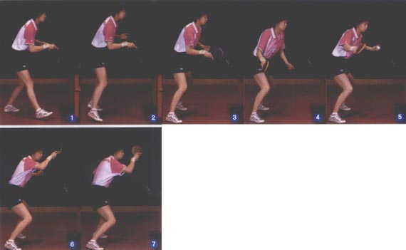 正手反拉弧圈球是一項難度較高的技術(shù)。在相持環(huán)節(jié)中,抓住機(jī)會反拉對方的弧圈球是防守轉(zhuǎn)攻的重要手段。反拉時,要求動作要緊湊,通過小幅度轉(zhuǎn)腰,身體迎前擊球,同時要注重身體重心交換的過程(圖4-7)。