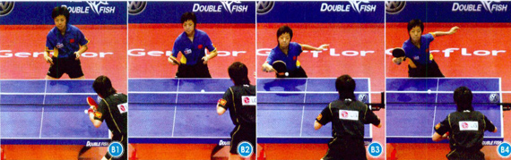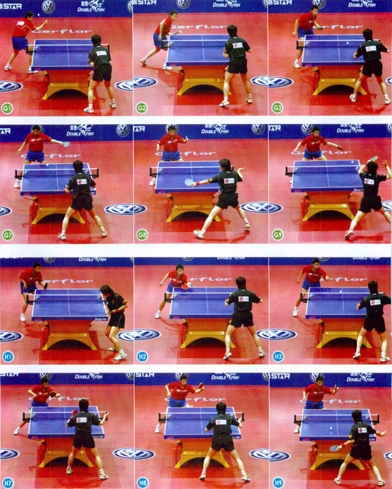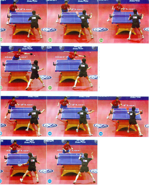 組圖H為王楠反手在臺(tái)內(nèi)直接發(fā)球搶攻的戰(zhàn)術(shù)套路。與組圖G的套路相同,王楠發(fā)球后,郭躍擺短,王楠上步用反手在臺(tái)內(nèi)拉球到郭躍的中路偏反手位置。郭躍退至中臺(tái)擋一板,王楠側(cè)身在來球的最高點(diǎn)反拉對(duì)方的正手位大角。與組圖G不同的是,王楠搶先上手后,郭躍回球的質(zhì)量不高,只是在中臺(tái)勉強(qiáng)擋了一板。王楠在下一板的進(jìn)攻中稍稍放慢了節(jié)奏,在最高點(diǎn)反拉,這樣拉球的旋轉(zhuǎn)更為強(qiáng)烈,也更為穩(wěn)健。