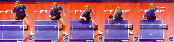 組圖C為鮑羅斯的反手臺(tái)內(nèi)拉球。鮑羅斯身高臂長,擅長中、遠(yuǎn)臺(tái)的相持,反手弧圈球的進(jìn)攻性很強(qiáng),力量大、旋轉(zhuǎn)強(qiáng)烈。在處理臺(tái)內(nèi)短球時(shí),鮑羅斯依靠身高的優(yōu)勢(shì)可以實(shí)現(xiàn)全面的進(jìn)攻。擊球前,預(yù)先判斷來球的