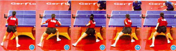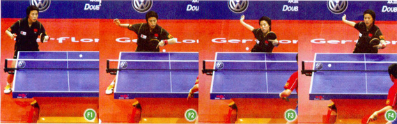 組圖E為牛劍鋒的反手臺(tái)內(nèi)抹。在處理中路或正手位來球的時(shí)候,優(yōu)秀的運(yùn)動(dòng)員都可以用反手拉側(cè)旋來回接,以增大回球的威脅。這樣的回球方舞在落點(diǎn)和旋轉(zhuǎn)變化上更加靈活,更加突然,增大了對(duì)方回球的難度。牛劍鋒在回球前,右腿向前的跨步很大,使身體貼近球臺(tái),右肩下沉,身體重心壓福很低,同時(shí)手腕內(nèi)收的幅度很大,身體和球拍正對(duì)來球:觸球瞬間,牛劍鋒依靠腿向前跨出的慣性,前臂突然向前伸,手腕向身體外側(cè)轉(zhuǎn)動(dòng),充分摩擦來球,將球回到對(duì)方正手位大角。這板回球的力量比較大,速度比較快;擊球后,牛劍鋒右腳向后蹬地,準(zhǔn)備好連續(xù)相持。