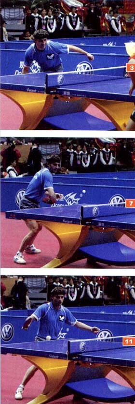 看格林卡的反手沖殺十分過癮,用大氣相稱絕不過分。從圖5—6中可以看到,拉球前格林卡將重心壓到右腿上;從圖7中我們發(fā)現(xiàn),格林卡腰部向左后的轉(zhuǎn)動;從圖8—10中反映出,格林卡全身協(xié)調(diào)用力的過程。乒乓球是全身性運(yùn)動,尤其在目前兇狠、力量占優(yōu)勢的時代,如何提高發(fā)力的技巧就顯得至為重要,高質(zhì)量的沖殺僅僅靠手臂的動作是不可能實(shí)現(xiàn)的。格林卡以右腿為軸.轉(zhuǎn)動重心,全身合一才能產(chǎn)生巨大的動力和慣性。其中腰部的轉(zhuǎn)動更為重要,因?yàn)檠渴侨梭w的樞紐,可以“承下啟上”,引動發(fā)力。因此,業(yè)余與專業(yè)的最大區(qū)別,就在于重心的運(yùn)用程度。