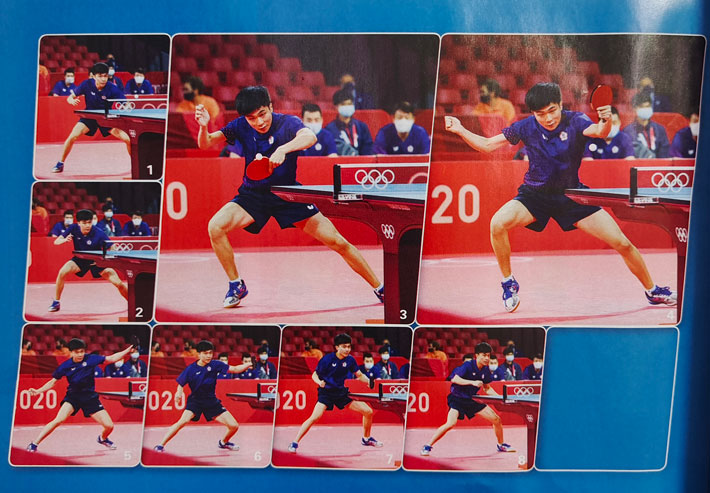 如圖1-3,林畇儒站住位置,隨著來球完成二次找球調(diào)整。圖2-5中,他在移動中進行反手搶拉。在這里我們可以關(guān)注一下他的雙腳隨著搶拉動作靈活調(diào)整的過程,充分保證了適度的擊球空間。同時,他的大腿和腰腹在全部擊球過程中一直處于極為穩(wěn)定的狀態(tài),保證擊球動作的質(zhì)量。擊球時,他町準來球,使用手臂帶動手腕做功,精確把握出手時機集中用力,并在觸球瞬間通過板形外翻的調(diào)節(jié)協(xié)助手腕摩擦岀合理弧線,利用旋轉(zhuǎn)和輕重力量的調(diào)控搶拉弧線的長短,充分展現(xiàn)了手上控球能力。