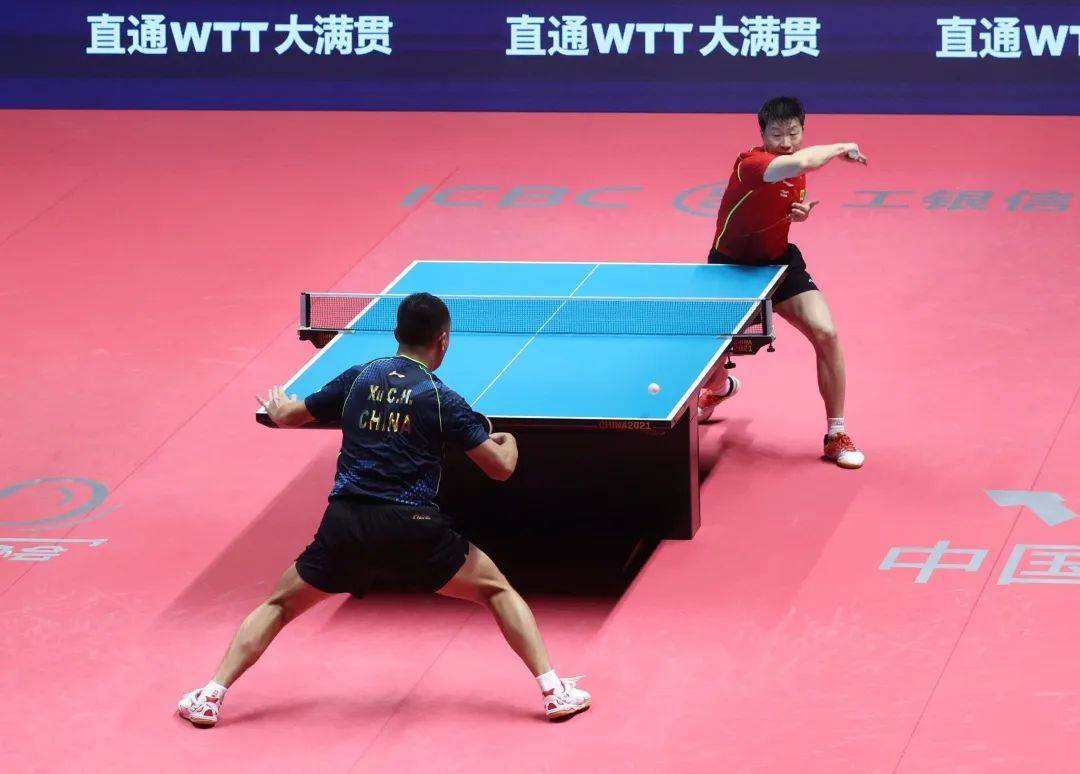 徐晨皓在準(zhǔn)備不充分的情況下,吃了馬龍發(fā)出的右側(cè)上旋,回擺了一板半高球到馬龍的中路短球位置。馬龍面對來球非常沉穩(wěn),沒有急于求成,他隨球側(cè)身放慢節(jié)奏,盯準(zhǔn)來球的長短,完成了精確的找球調(diào)節(jié)。同時,他看著對方慌亂的跑動方向,決定借機(jī)打出時間差,繼續(xù)沖拉對方正手大角的落點。馬龍的動作大開大合,擊球瞬間迅速調(diào)整板形,卷沖出斜線的刁鉆角度到對方的正手空當(dāng),通過擊球質(zhì)量一擊致命,展現(xiàn)了超一流的正手得分能力。